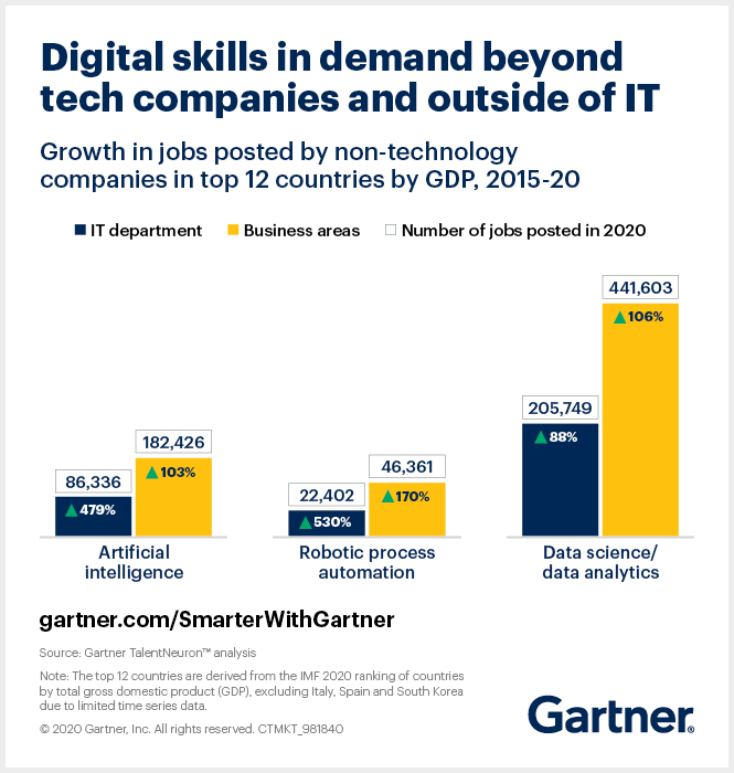 An organization’s digital transformation is put on the back burner when faced with a lack of skilled employees. Gartner reports that in the last five years, the growth in jobs requiring digital skills posted by non-tech companies in top 12 countries by GDP has risen significantly, especially around AI, RPA and data science.