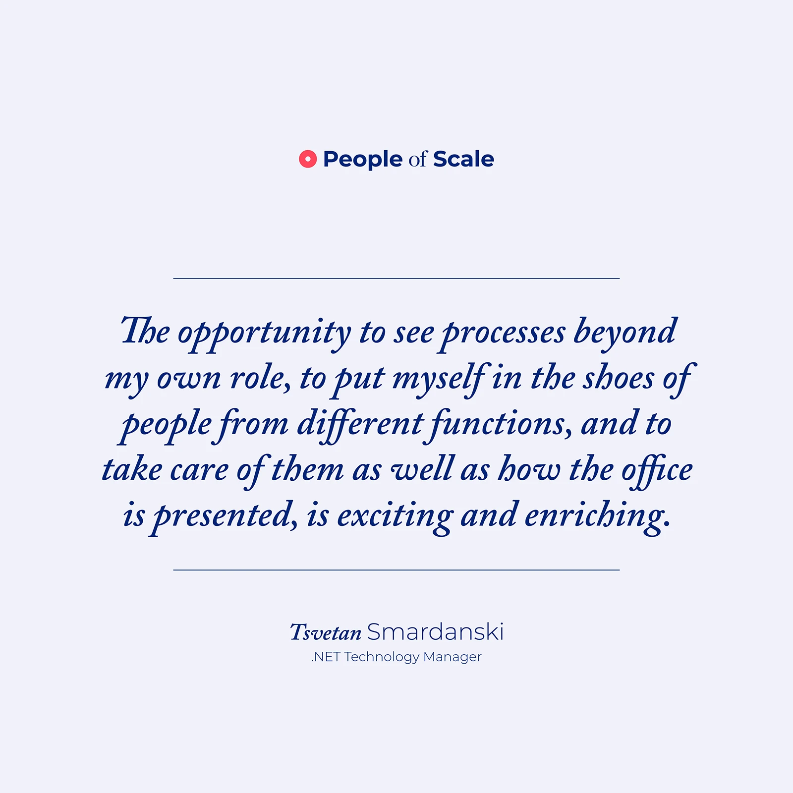 I am working to grow our .NET team and the office in Burgas. The two objectives involve a different focuses. The goal of the technology team is to be competitive in the global market, and we have a department of proven professionals who strive to overcome every challenge – from development to implementation of the smallest detail. For a team to be sustainable, it must be composed of people with different expertise. That’s why at Sclaefocus we highly encourage knowledge-sharing – more experienced colleagues pass their skills to newbies, and newbies, in turn, contribute with fresh ideas. A big chunk of our efforts is dedicated to laying the base which allows everyone to navigate easily and reach the established working practices in the team.