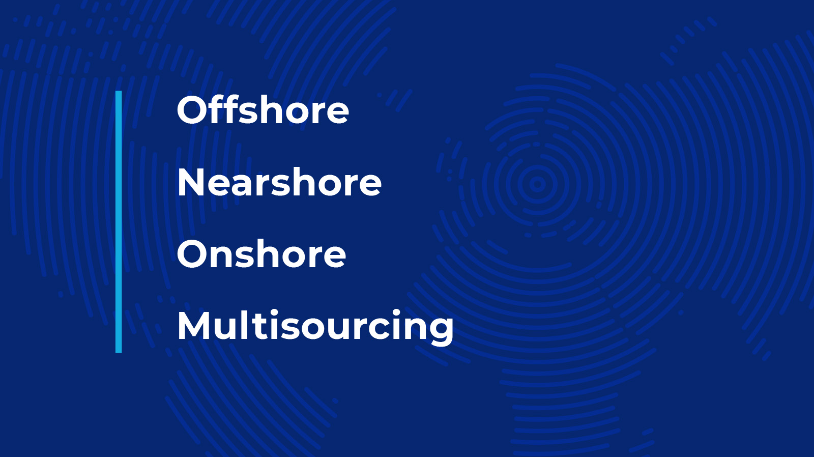 Multisourcing is a combination of the above in a way that allows you to diversify by working with several vendors from various locations. For example, you may want your technical team to be outsourced in an offshore location, while you keep your management onshore near you.