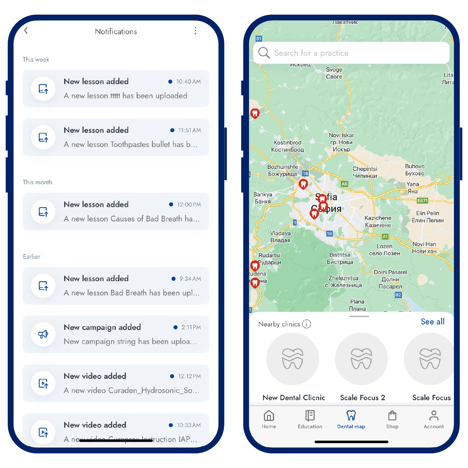1. Notifications screen  2. Dental map screen
